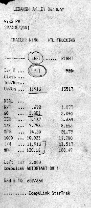 10/30/99 I'll copy the slip later, but she pulled a 13.2x @ 103.x mph as well. Way To GO, Josey!